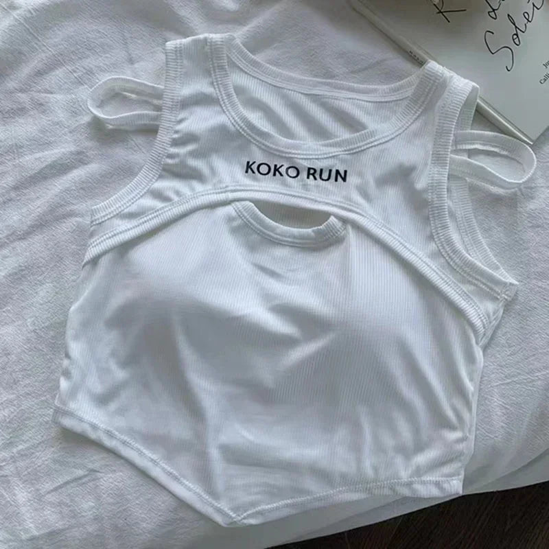 Casual Crop Tops For Women Knitting Irregular Tops Hollow Out Camisole Women Fake Two Pieces Tank Tops With Bra Pad